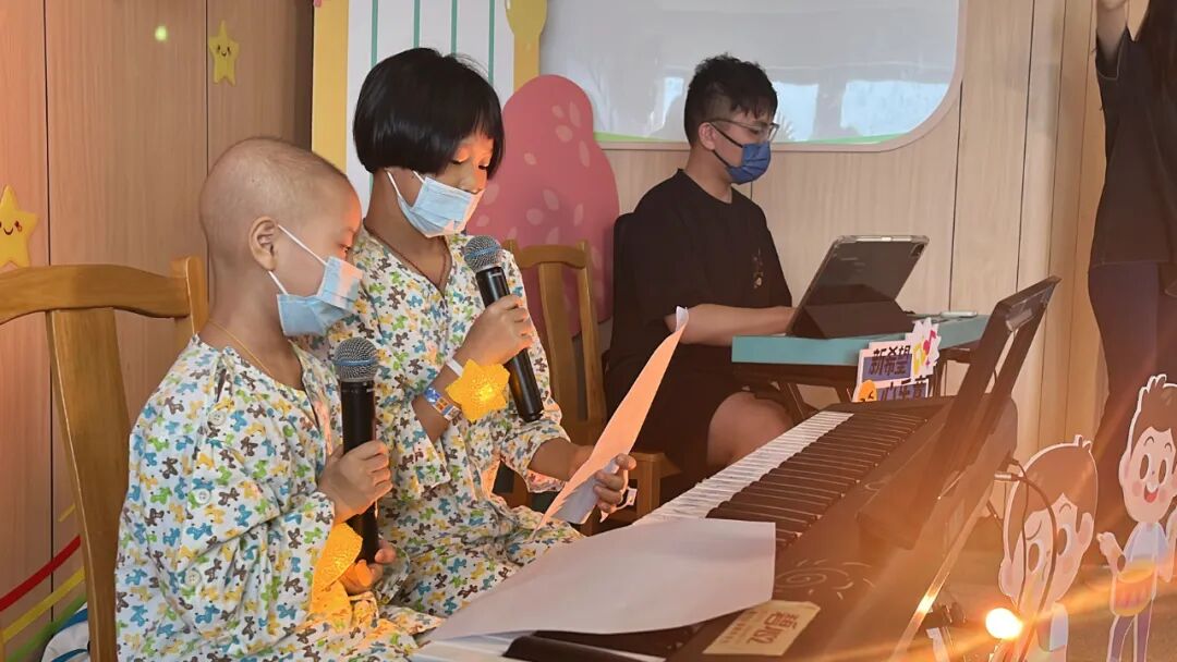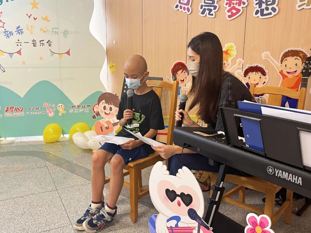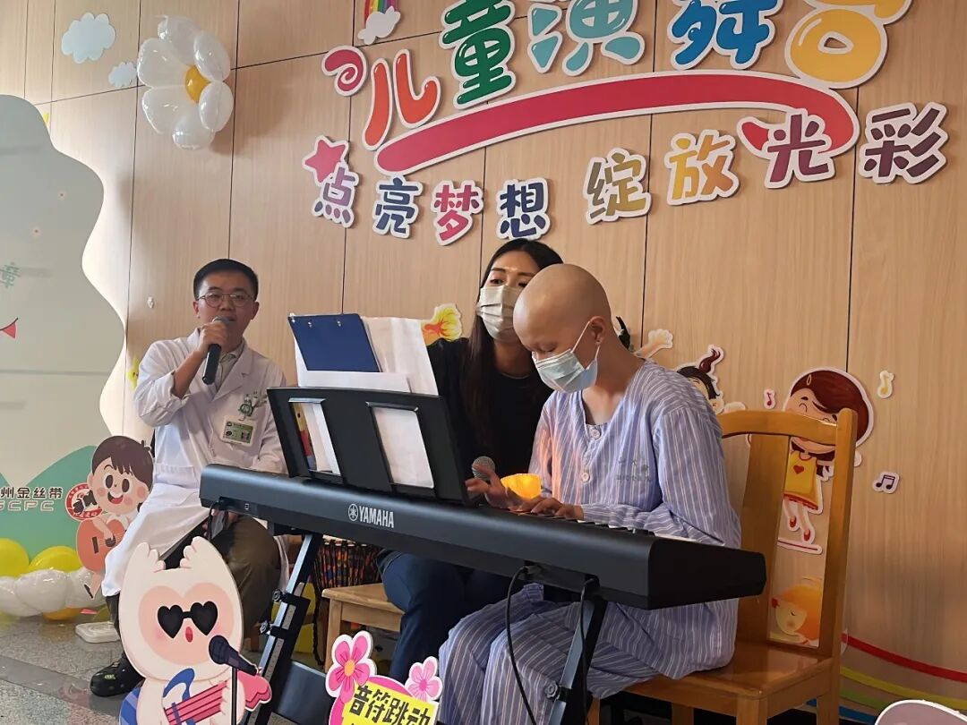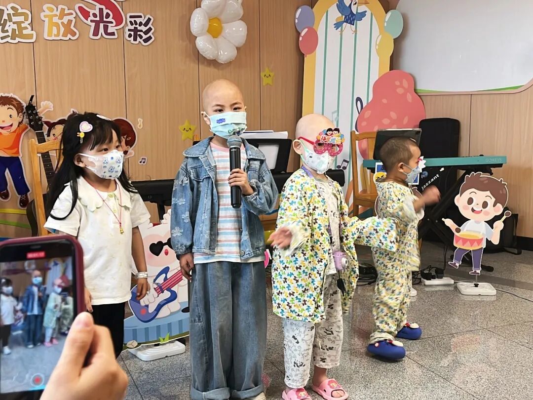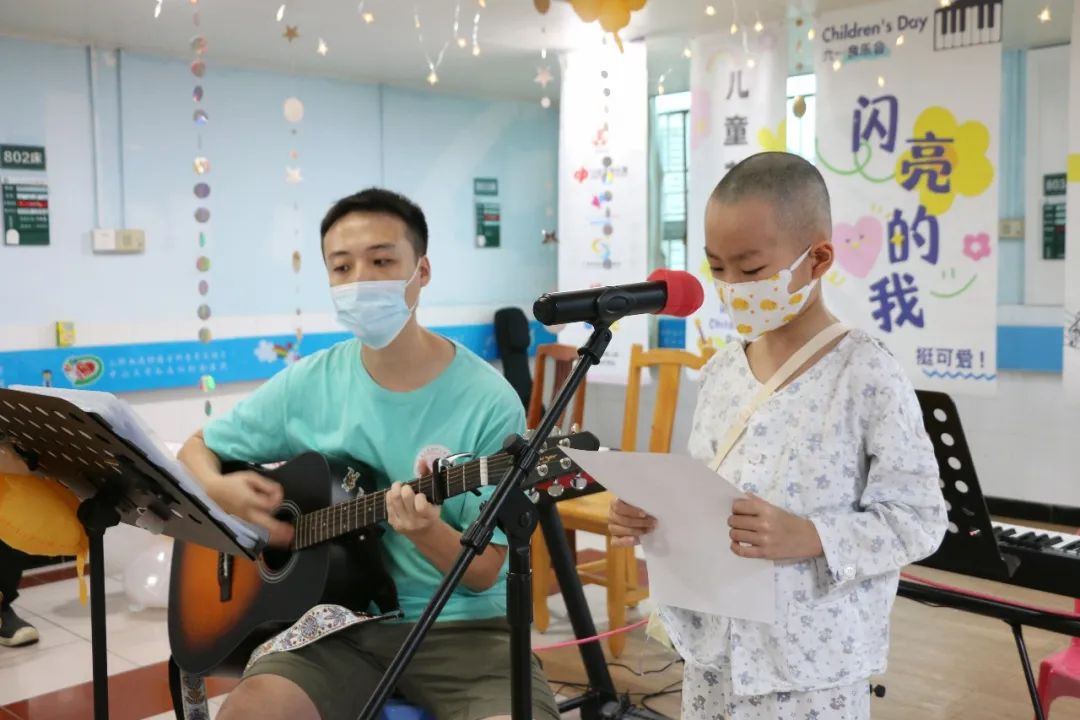 活动伊始,儿童医学中心主任、血液科主任周敦华教授上台致辞,向孩子们送上节日的祝福,作为花都院区启用后的首场儿童节活动,周主任表示,愿音乐如同新院区的阳光,照亮孩子们的康复之路,一同展望美好的生活。音乐会秉承着“人人可参与”的开放形式,鼓励每一位参与者表达自我。“我们拍拍手、我们跺跺脚,欢迎来到音乐王国……”在音乐治疗师与志愿者带领的《音乐王国》互动开场中,大家开始放松下来,投入到放松的音乐中。音乐会上,孩子们表演的曲目均由Ta们自主选择,音乐治疗师、与志愿者全程提供支持。即使身着病号服,也阻挡不了孩子们天真活泼、喜欢热闹和热爱音乐的天性,Ta们暂时忘却了病痛,展现出满满的生命力。台下的小观众们则握着星星灯,随节奏挥舞,用掌声和欢呼支持着台上的表演者。小主持人浠浠和茵茵搭档护士姐姐雪婷姐姐,为大家清晰报幕,展现了她们专业认真的一面。音乐治疗师张彦昕陪伴浩浩演唱热门电影主题曲《就是哪吒》,演绎“我命由我不由天”的精神。能歌善舞的小妍带来舞蹈《问题小孩》,歌曲《爱要坦坦荡荡》,在舞台上,她仍然表现得游刃有余,两位小朋友也即兴加入伴舞中。主持人茵茵弹奏起《特别的人》,这是她很喜欢的歌曲。在活动前,她与音乐治疗师一起认真练习。还有小乐手小振弹奏《孤独患者》,有了音乐与爱的陪伴,我们都不再孤独。王智轩医生深情演唱《love song》《至少还有你》,现场的灯海为他点亮。易娱公益志愿者吴梅钢琴演奏,小朋友也自信加入合唱~公益伙伴齐声唱响《海阔天空》,一位孩子的父亲也参与合唱:“原谅我这一生不羁放纵爱自由”,此时的歌词传递着更厚重的祝福。音乐会以一曲深情的《月亮代表我的心》结尾,医院领导、科室医护人员和公益伙伴一起大合唱,琴声、歌声和笑声交织在一起,成为难忘的回忆。看,小朋友给大家比心啦!每一位参与表演的孩子,都收到“超级小明星”的奖状,还有丰富的奖品和礼包,拍照时,脸上洋溢着喜悦与自豪,对Ta们来说,这注定是一个快乐又难忘的儿童节!这场音乐会不仅是节日庆典,更是碧心公益携手广州音乐治疗师团队在儿科一区、儿科六区、南院儿童造血干细胞移植科开展“病房中的音乐治疗”项目成果的呈现。自2023年项目启动以来,音乐治疗师团队通过聆听音乐、歌曲创作、乐器演奏等多元化干预,为患儿开展优质的音乐治疗,缓解恐惧、焦虑或抑郁等心理压力。2024年 孙逸仙纪念医院儿科一区“拥抱你2024”新年音乐会2024年 孙逸仙纪念医院儿科一区“闪亮的我”六一音乐会在音乐会上,孩子们可以随时跟着音乐歌唱、舞动,展现积极的自我,增强自信心。患儿、家属、医护人员、公益志愿伙伴也能在其中,感受到安全、快乐和融洽的社交氛围。“茵茵昨天好开心,真心感谢碧心公益所有哥哥姐姐们,是你们让孩子们在这枯燥、乏味艰辛的治疗路上多了许多温暖开心难忘的回忆。”音乐会小主持人茵茵的妈妈向我们表达了感谢。在此,祝福孩子们六一儿童节快乐!早日康复!让歌声留住互相连接、充满希望的美好部分!